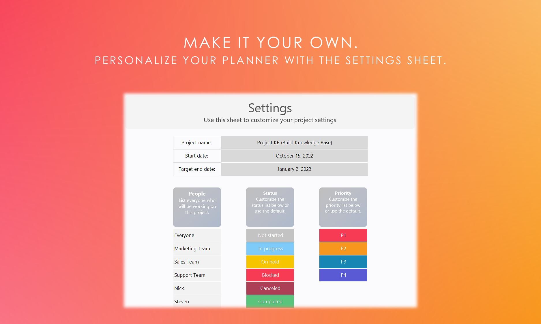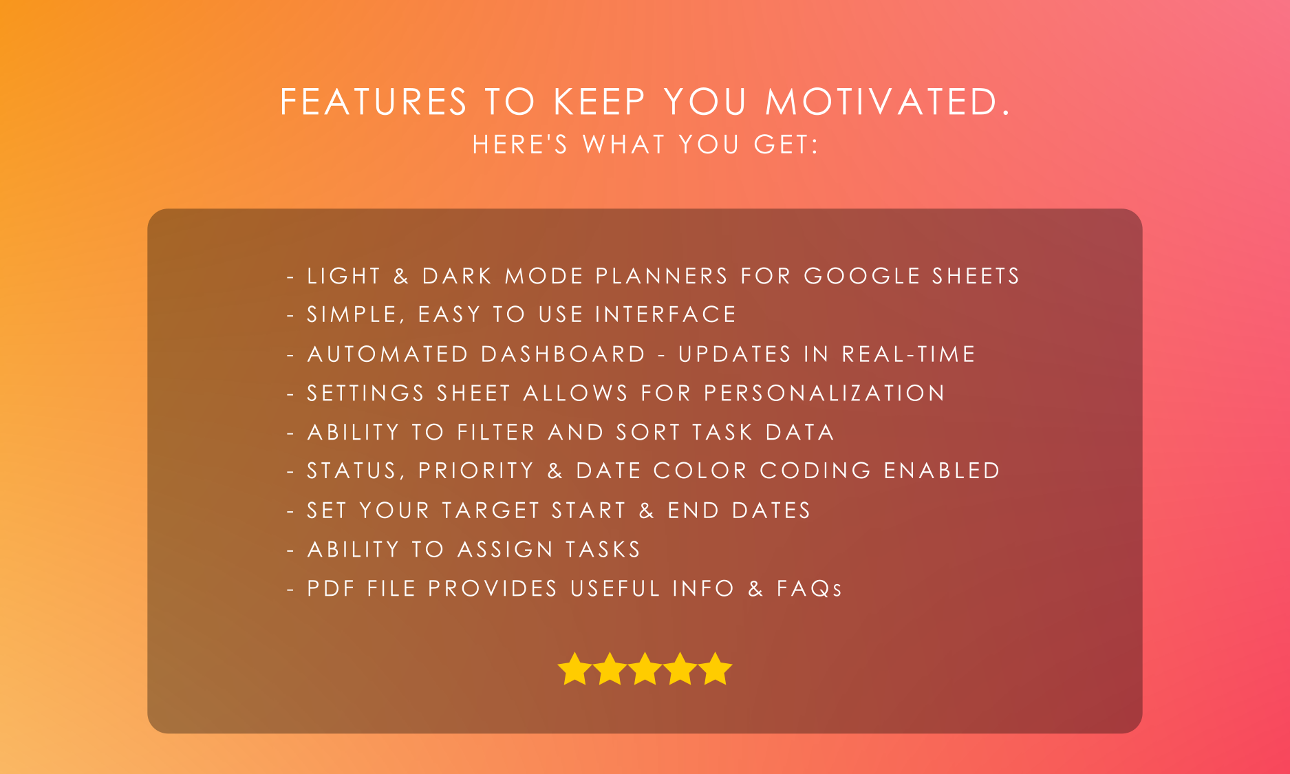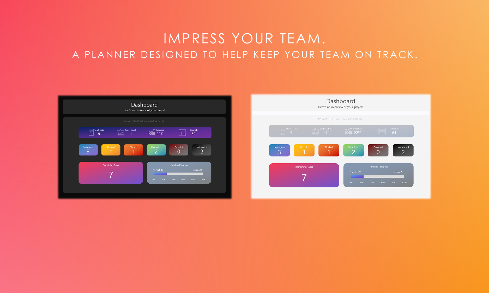 - Description: Plan & organize all your projects tasks in one easy to use spreadsheet. Designed to be intuitive and empower you and your team to stay on top of your project. Assign tasks to your employees or team member, prioritize tasks and keep their statuses up to date. Set due dates & percentage of completion. See your project stats at a glance with the beautiful Dashboard sheet, which is completely automated. Choose between light and dark mode themes! You'll be sure to impress your team (and your boss) with this high quality planner.