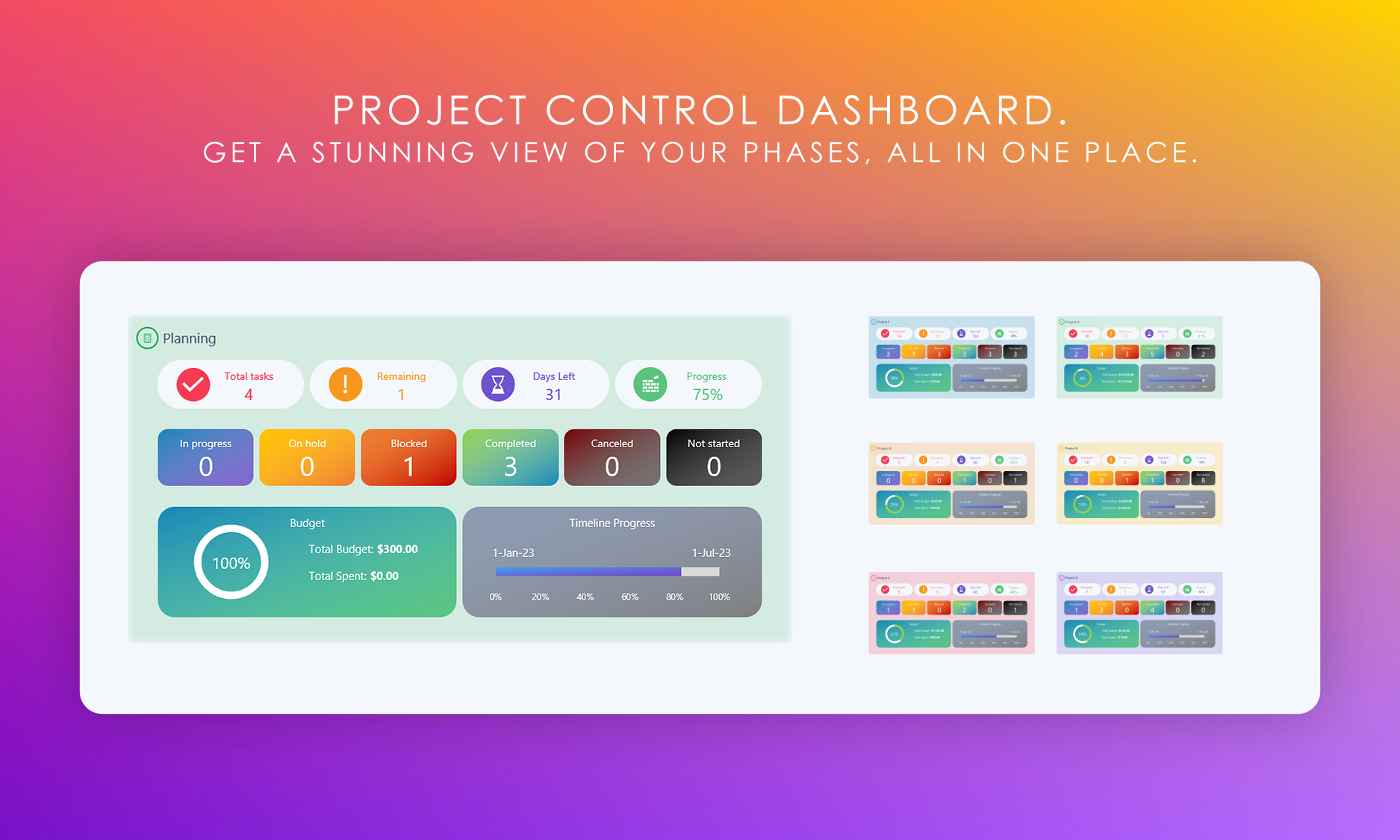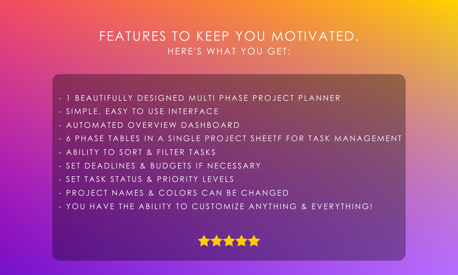 ✔️Supports up to 6 project phases (Example phases: "Q1, Q2, Q3, Q4" or "Planning Phase, Execute Phase" or "This month, Next Month" etc...)