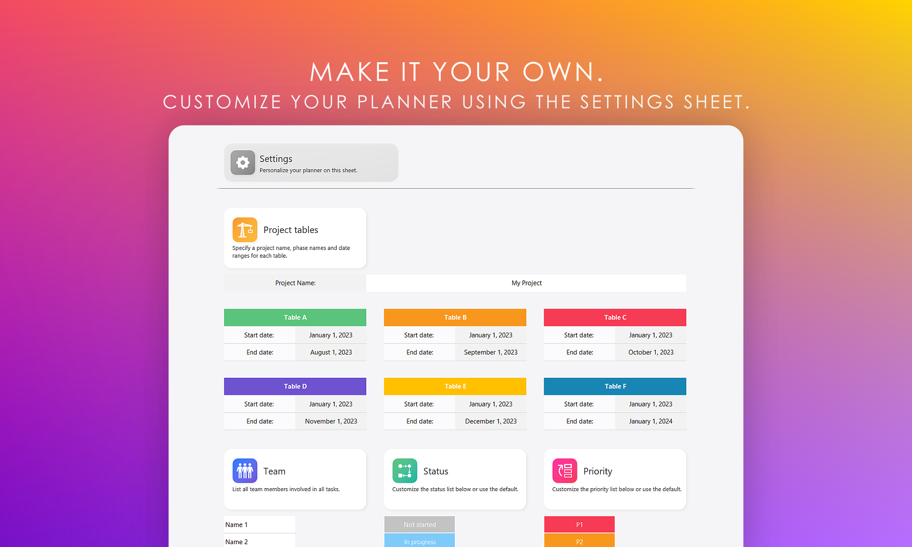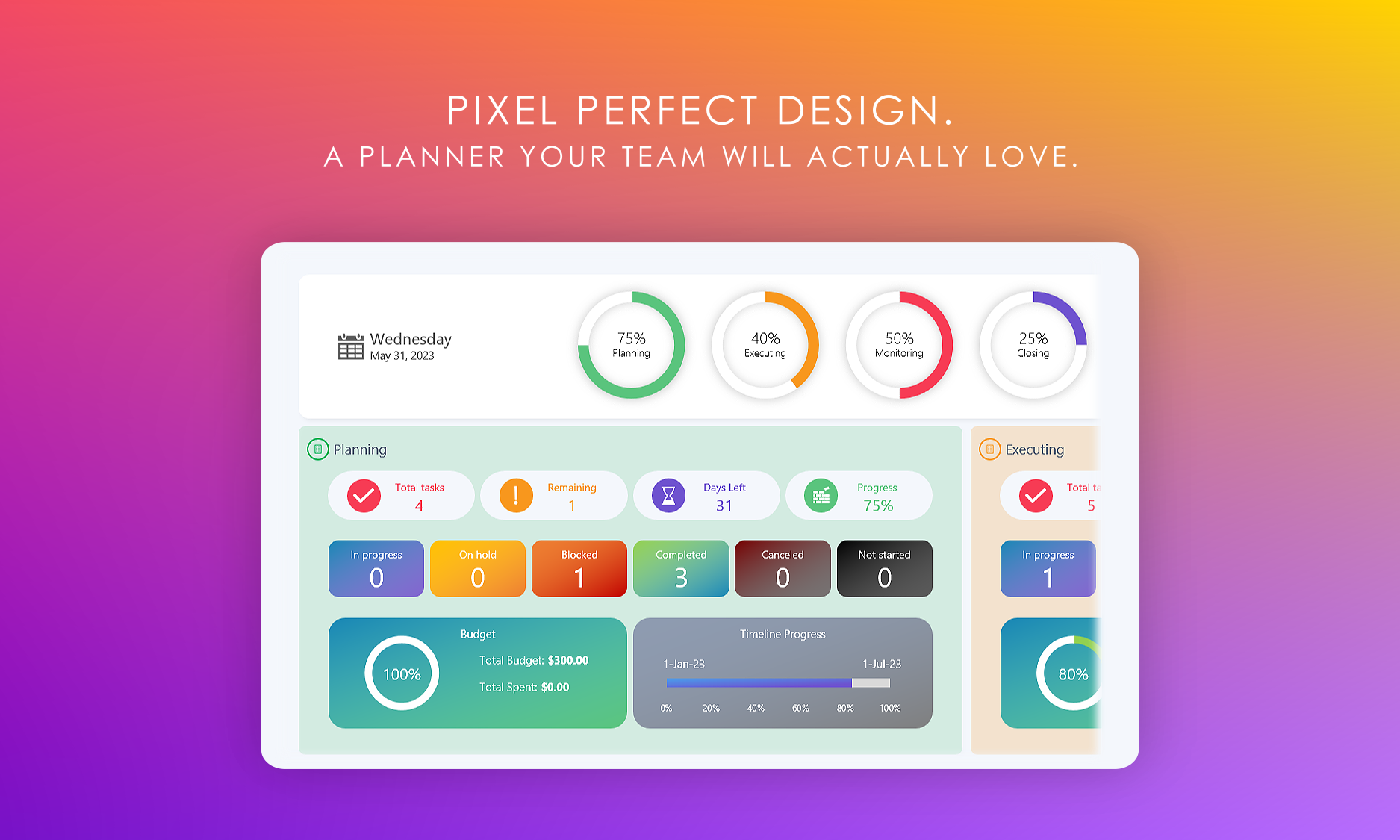 - Description: Plan & organize multiple project phases in one easy to use excel spreadsheet. Designed to be intuitive and empower you and your team to stay on top of your projects. Assign tasks to your employees or team member, prioritize tasks and keep their statuses up to date. Set due dates, budgets & percentage of completion. See your project stats at a glance with the beautiful Dashboard sheet, which is completely automated. You'll be sure to impress your team (and your boss) with this high quality planner.