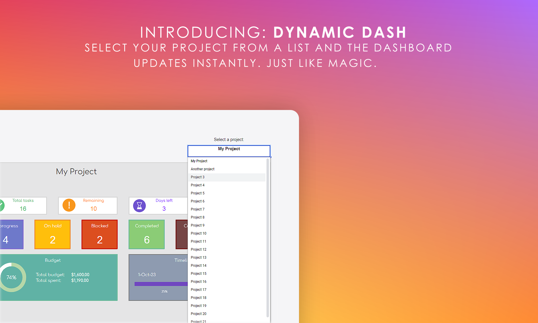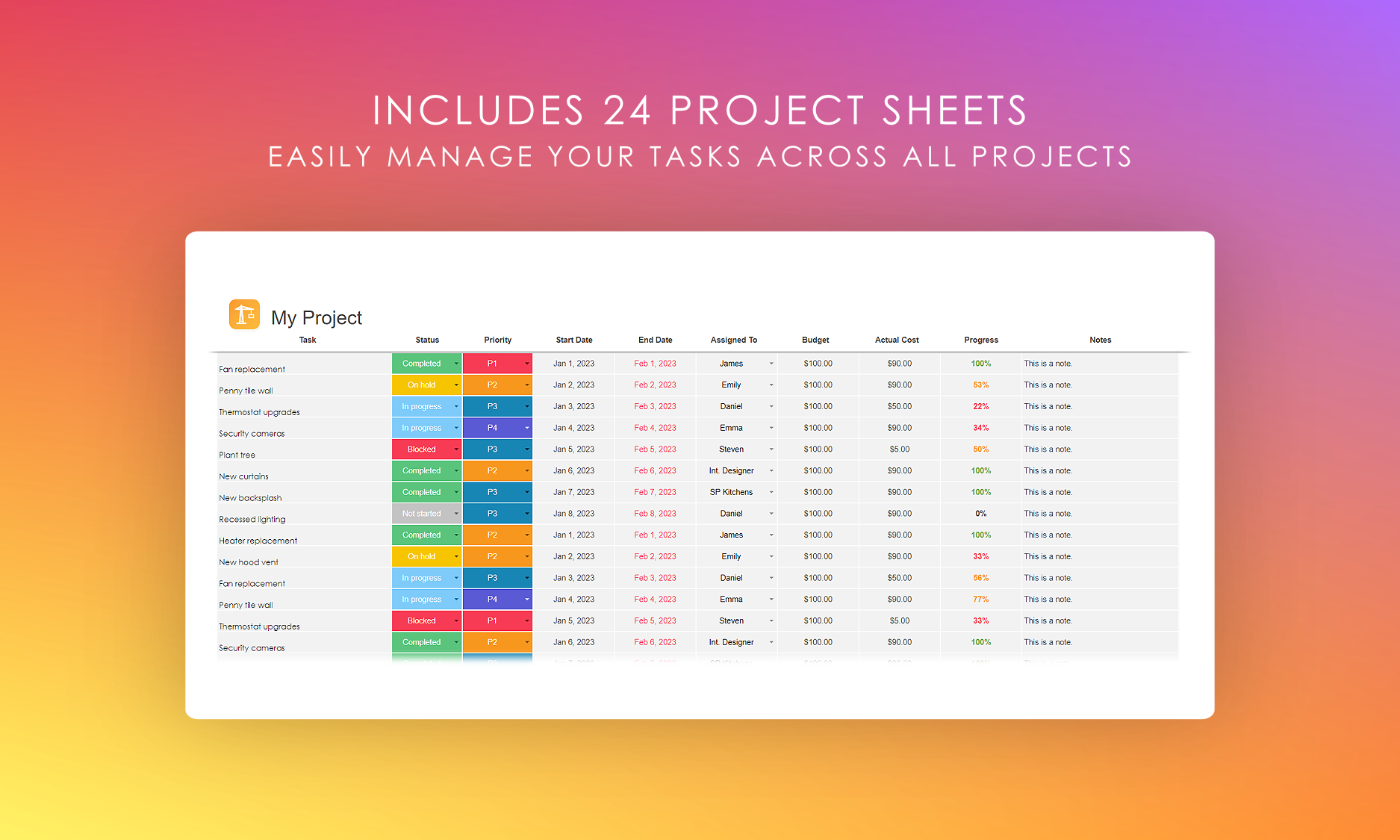 - Description: Plan & organize multiple projects in one easy to use spreadsheet for Google Sheets. Designed to be intuitive and empower you and your team to stay on top of your projects. Assign tasks to your employees or team member, prioritize tasks and keep their statuses up to date. Set due dates, budgets & percentage of completion. See your project stats at a glance with the beautiful Dashboard sheet, which is completely automated. You'll be sure to impress your team (and your boss) with this high quality planner.