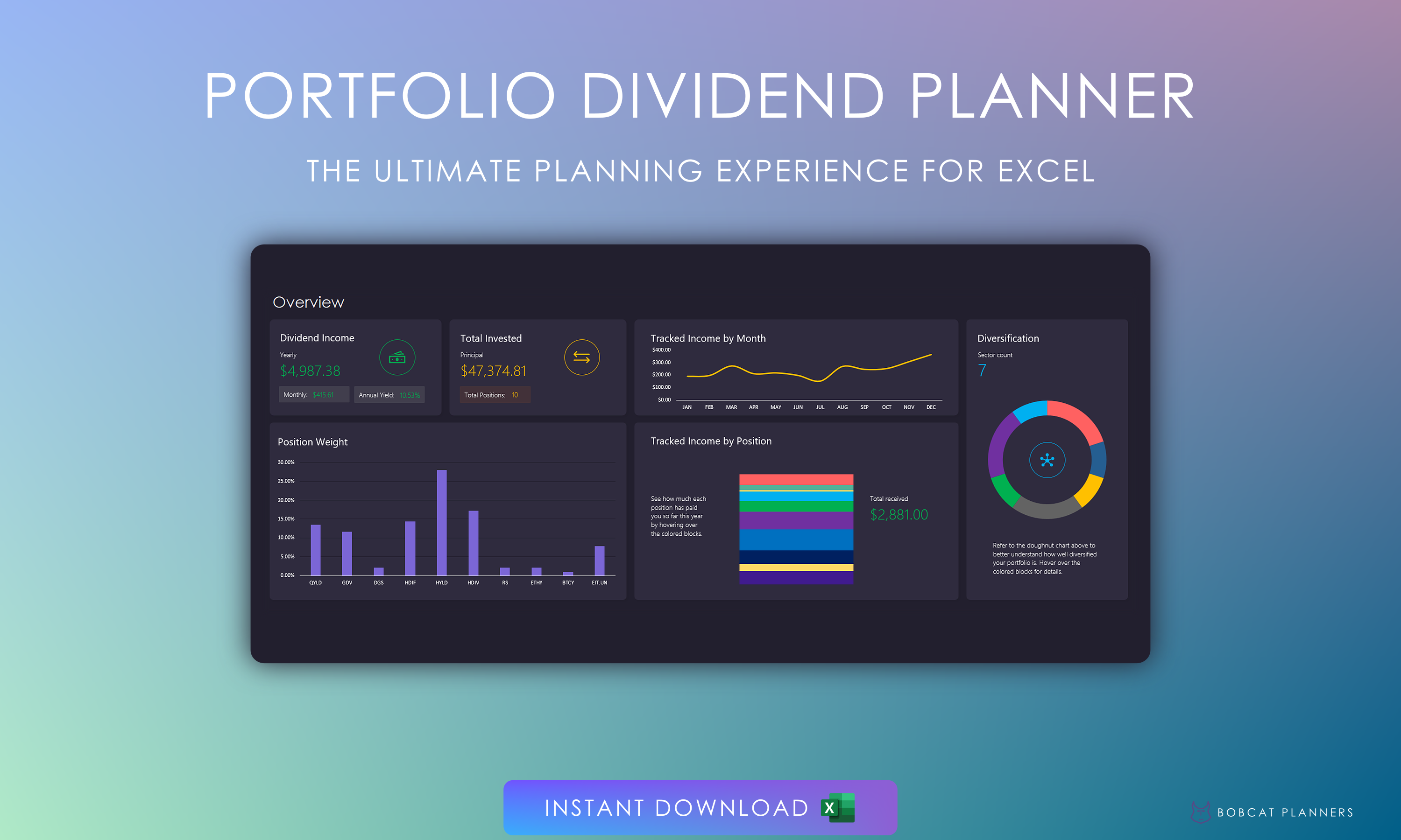 - Description: Plan, track & organize Stocks, Funds, ETFs, and more in this easy-to-use spreadsheet for Microsoft Excel. Designed to be intuitive and empower you to stay on top of your dividend income. A beautifully designed one-of-a-kind dashboard automatically shows you how much you'll make in passive income for the month and year. Your annual dividend Yield % is automatically displayed for you. This planner also lets you track your dividend income and then automatically displays beautiful visuals on the dashboard.