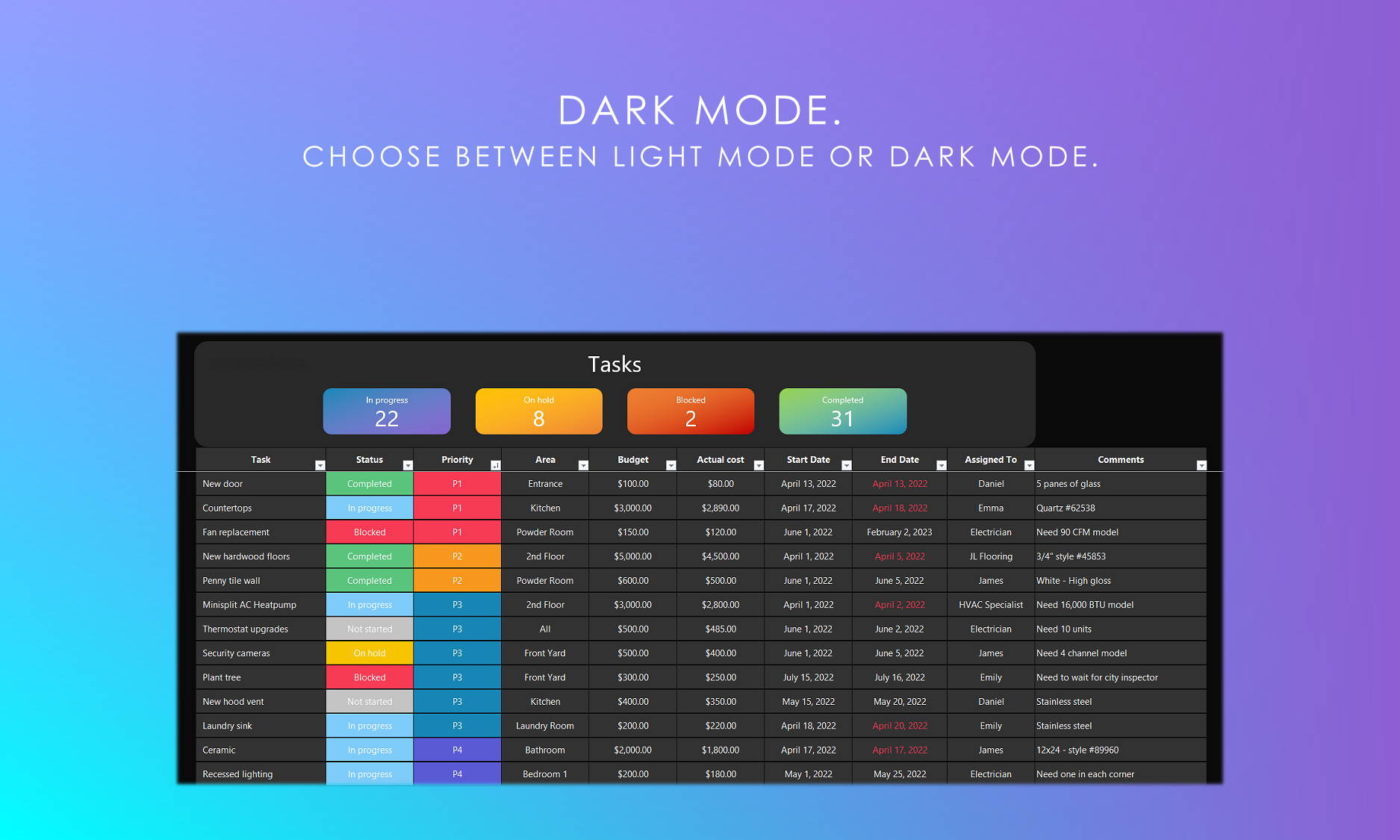 - Description: Plan , track , organize , and budget all your renovation tasks in one easy to use spreadsheet. This visually stunning renovation planner lets you budget & prioritize your tasks and keep their statuses up to date. Choose which area of the property a task belongs to while setting budget & timeline goals. An automated dashboard gives you a clear overview of your project. Perfect for a bathroom renovation, kitchen renovation or whole home renovation. Choose between light and dark mode themes (you get both)!