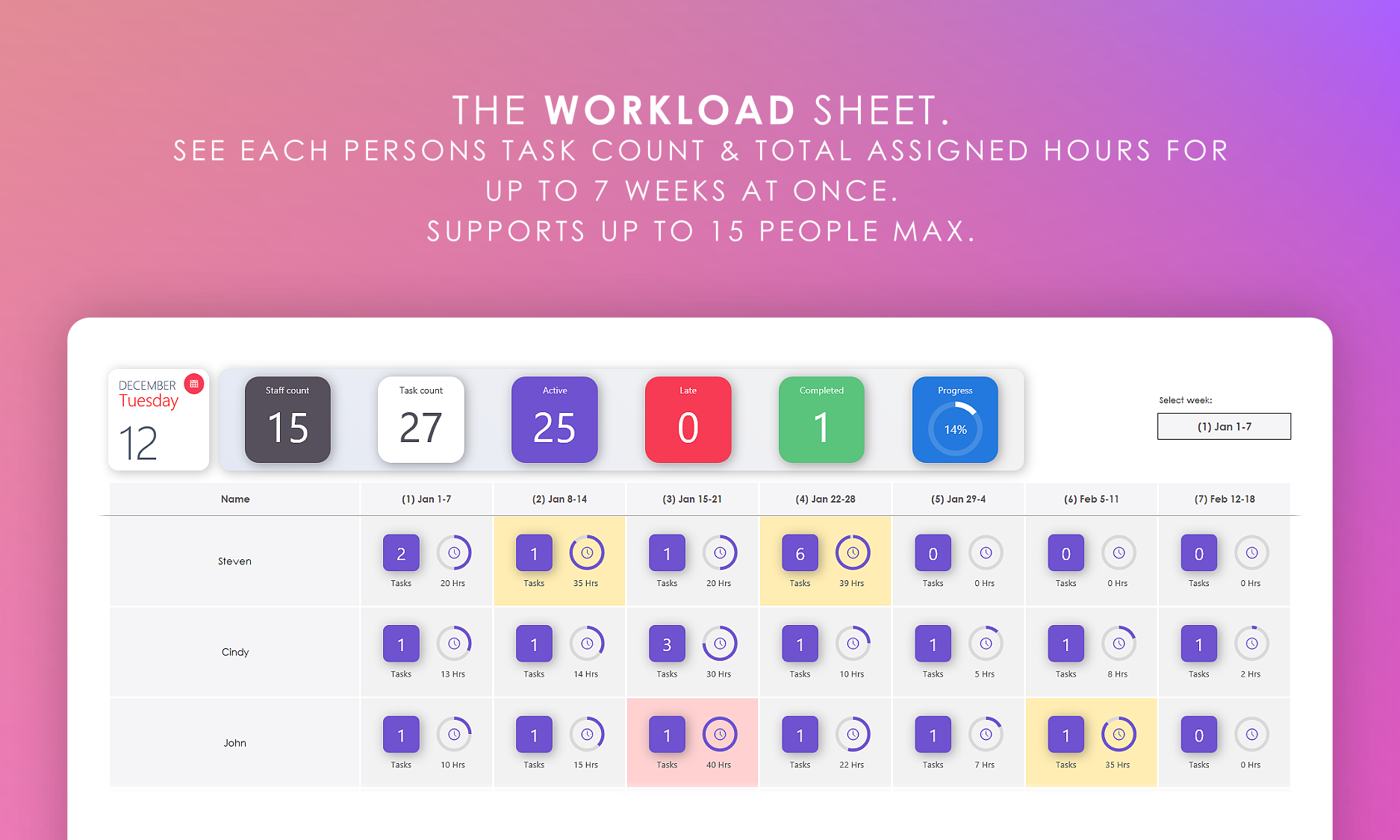 - Description: Introducing Workload Planner for Excel - a revolutionary tool that allows you to visualize your teams weekly workload with ease.