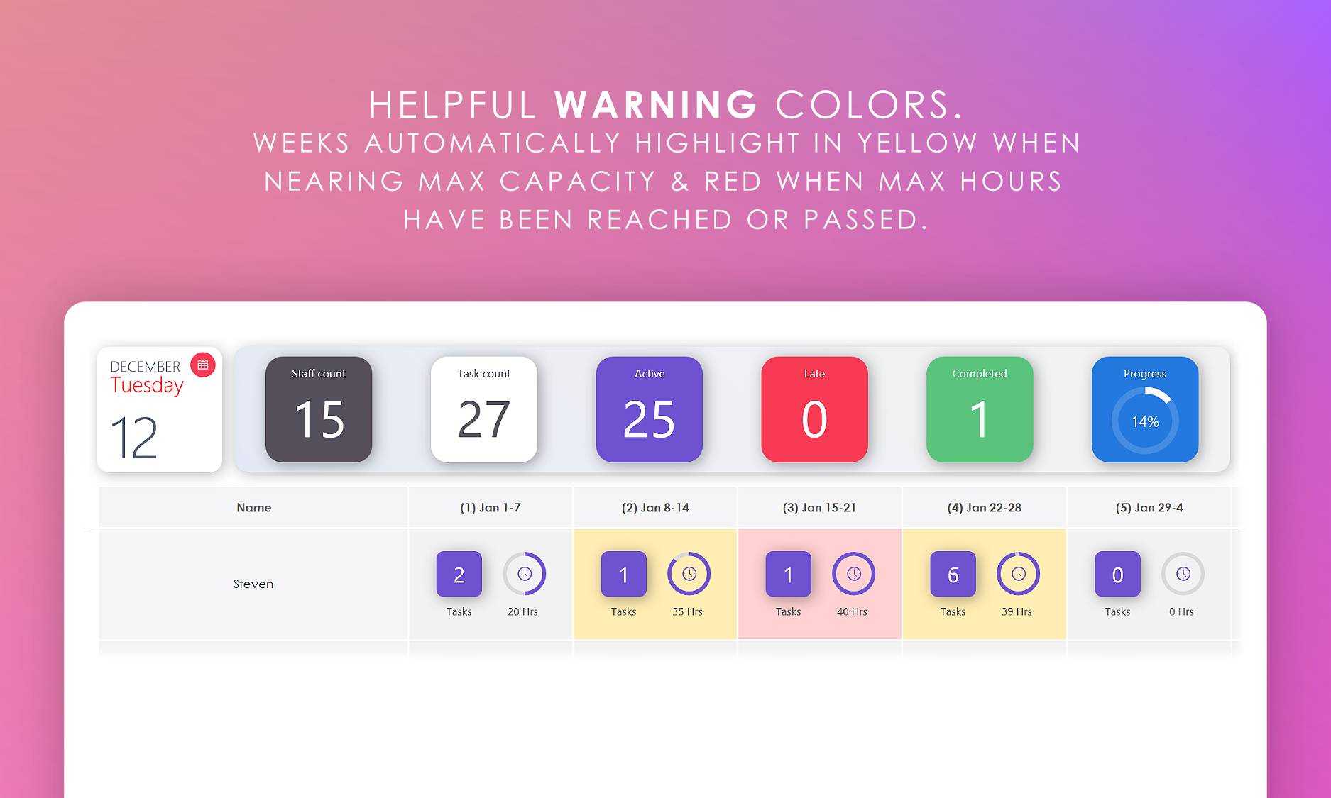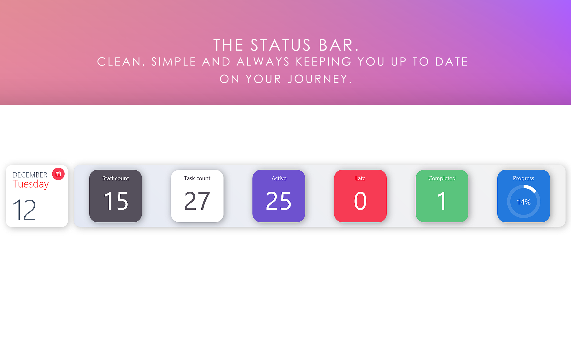 Enjoy a modern status bar that provides valuable insights such as today’s date, staff count, the total number of tasks, active task count, the number of late and completed tasks, plus a progress indicator. That’s a wealth of information at your fingertips!