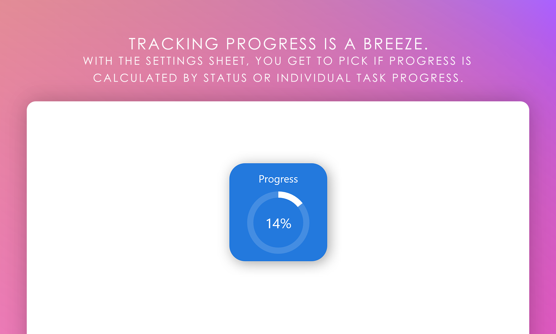 🟢 Tip: The 'Progress' tile in the upper status bar calculates the result by looking at task statuses by default. To use the Progress column instead, change the setting called 'Calculate completion by status or progress' to 'Progress' on the Settings sheet under General.
