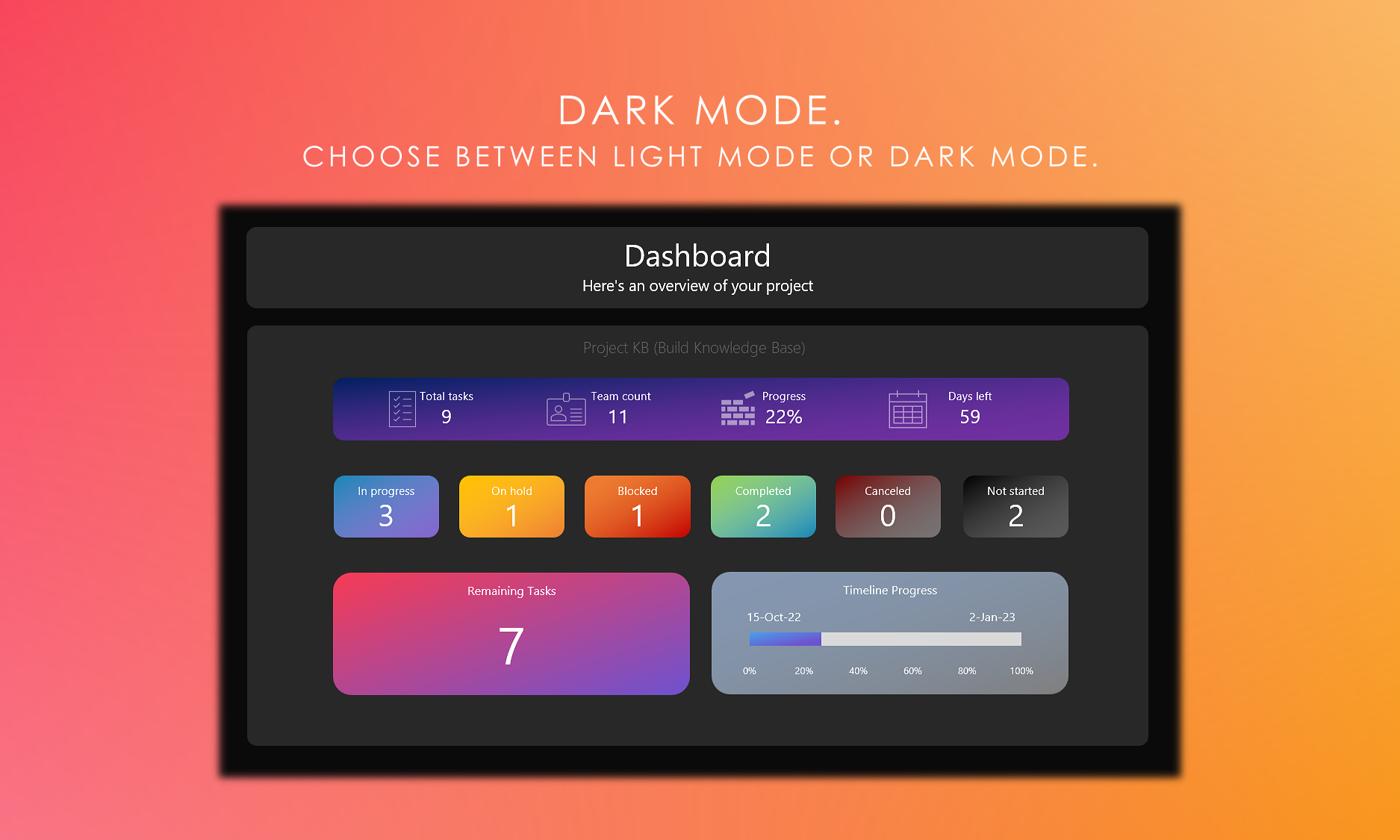 - Description: Plan & organize all your projects tasks in one easy to use spreadsheet. Designed to be intuitive and empower you and your team to stay on top of your project. Assign tasks to your employees or team member, prioritize tasks and keep their statuses up to date. Set due dates & percentage of completion. See your project stats at a glance with the beautiful Dashboard sheet, which is completely automated. Choose between light and dark mode themes! You'll be sure to impress your team (and your boss) with this high quality planner.