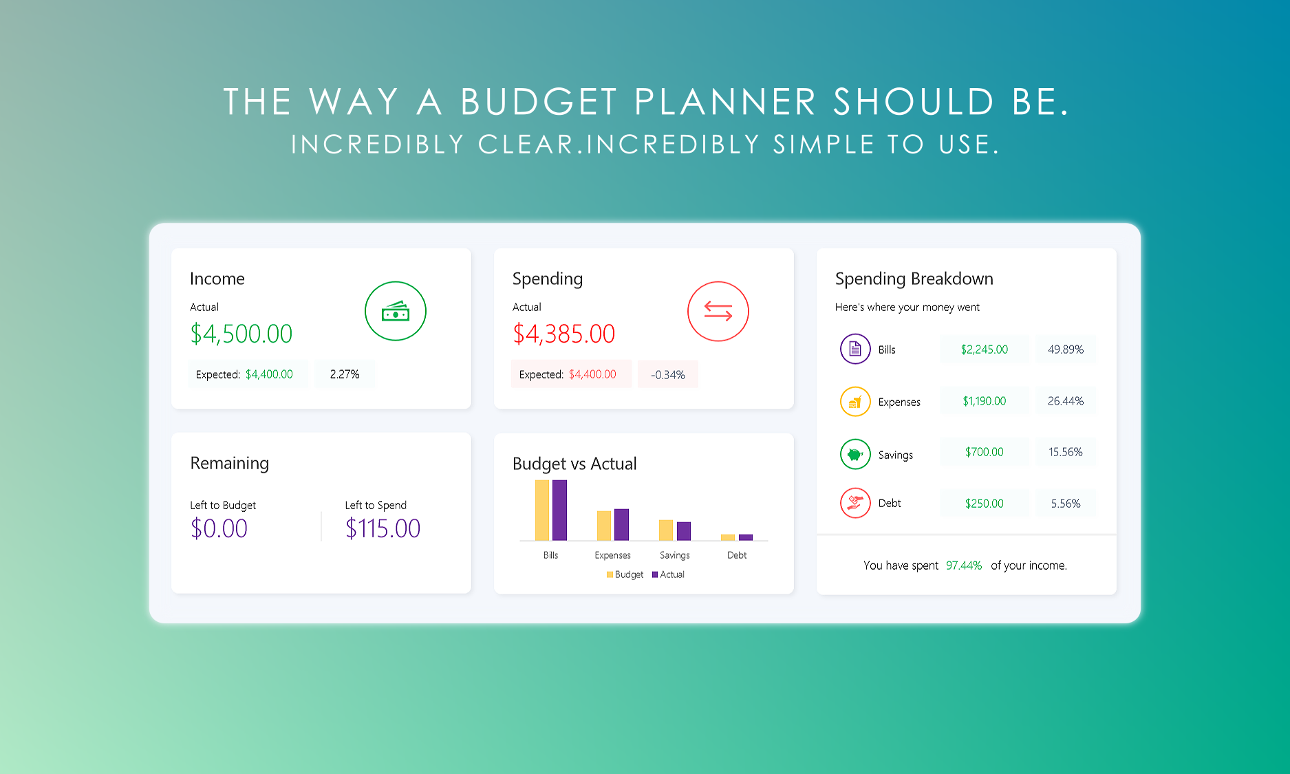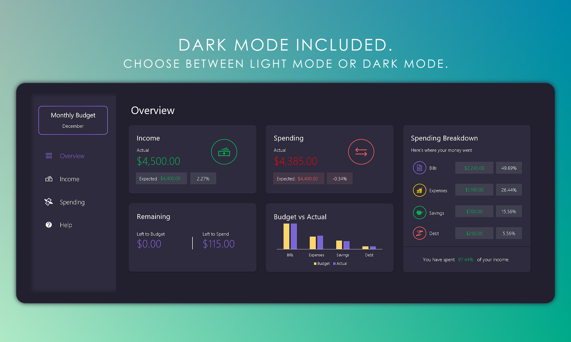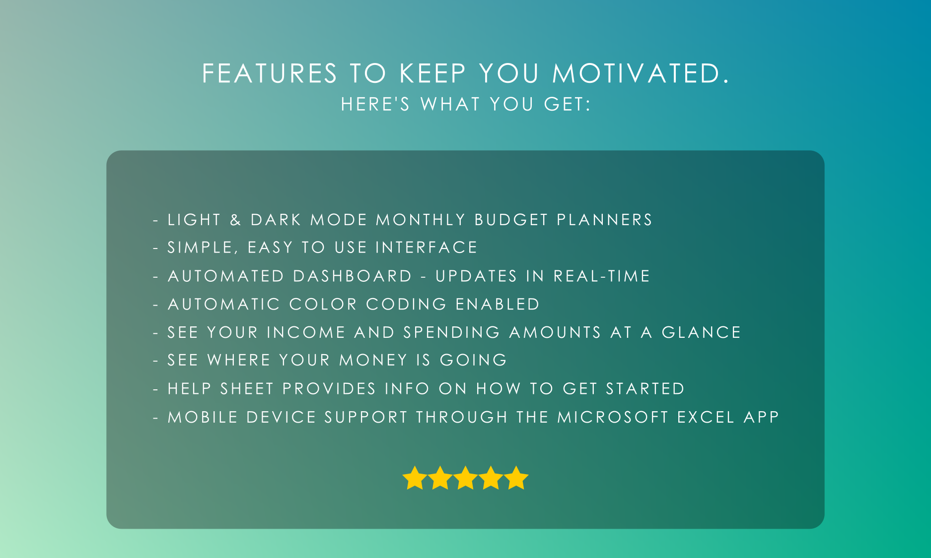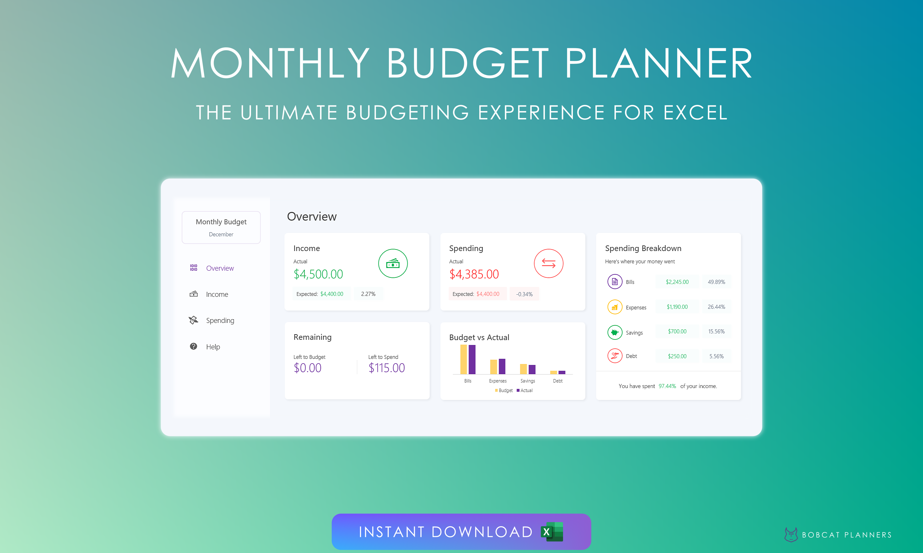 - Description: Budget your monthly finances with this easy to use Spreadsheet Template for Excel . Designed to be intuitive and empower you to stay on top of your finances. Keep track of your income & expenses. A beautifully designed dashboard performs all the calculations for you, so you can see your financial situation at a glance.