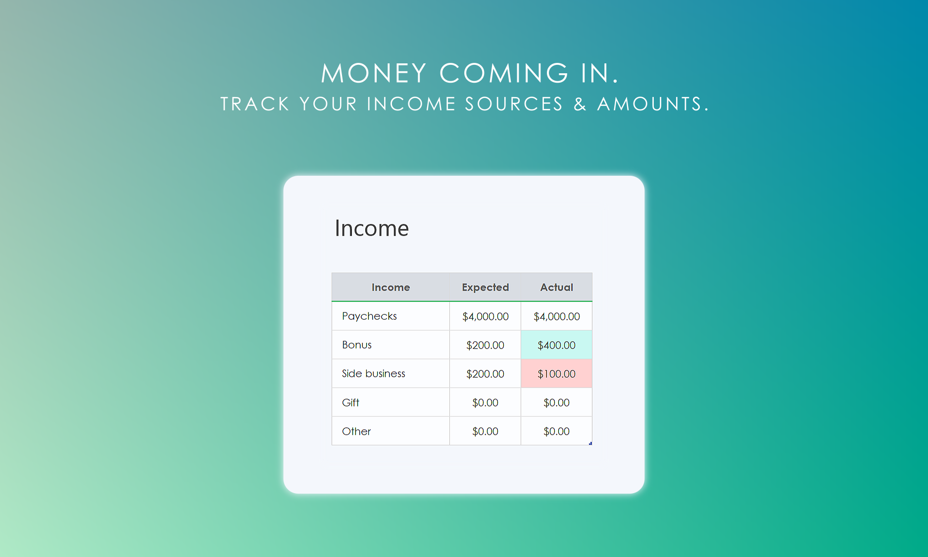 The Income sheet is the first sheet you should fill out. Enter all your sources of Income along with how much you expect to earn (Expected) and how much you actually earned (Actual).