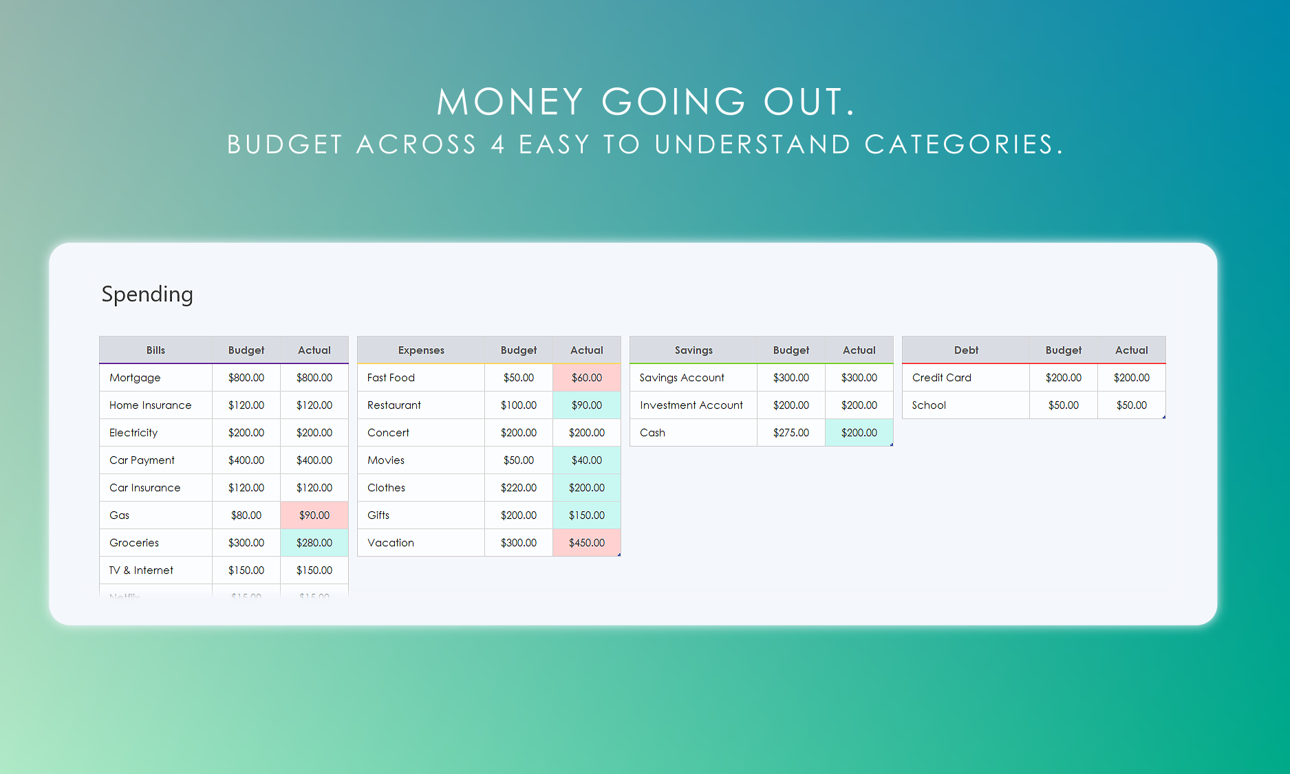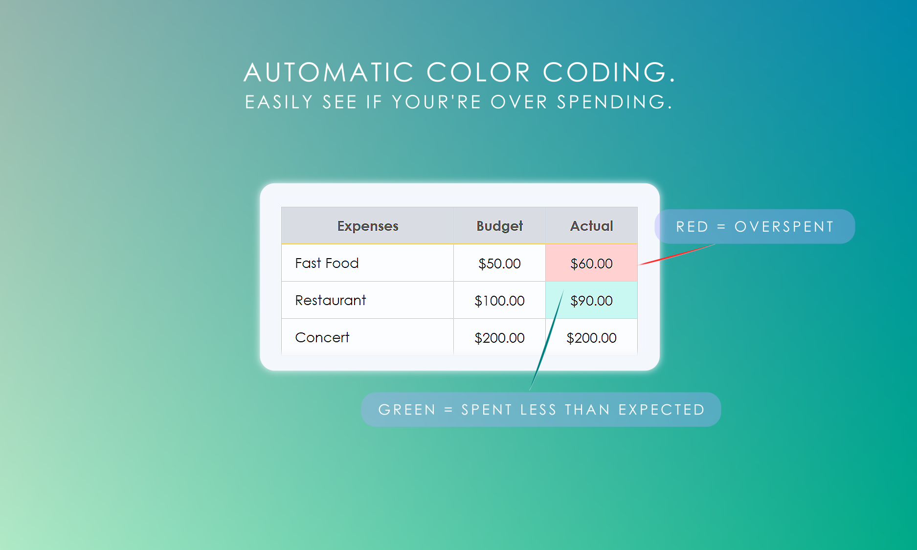 If you spend Less than the budget amount, the Actual cell will appear in green. If you spend More than the budget amount, the Actual cell will appear in red.