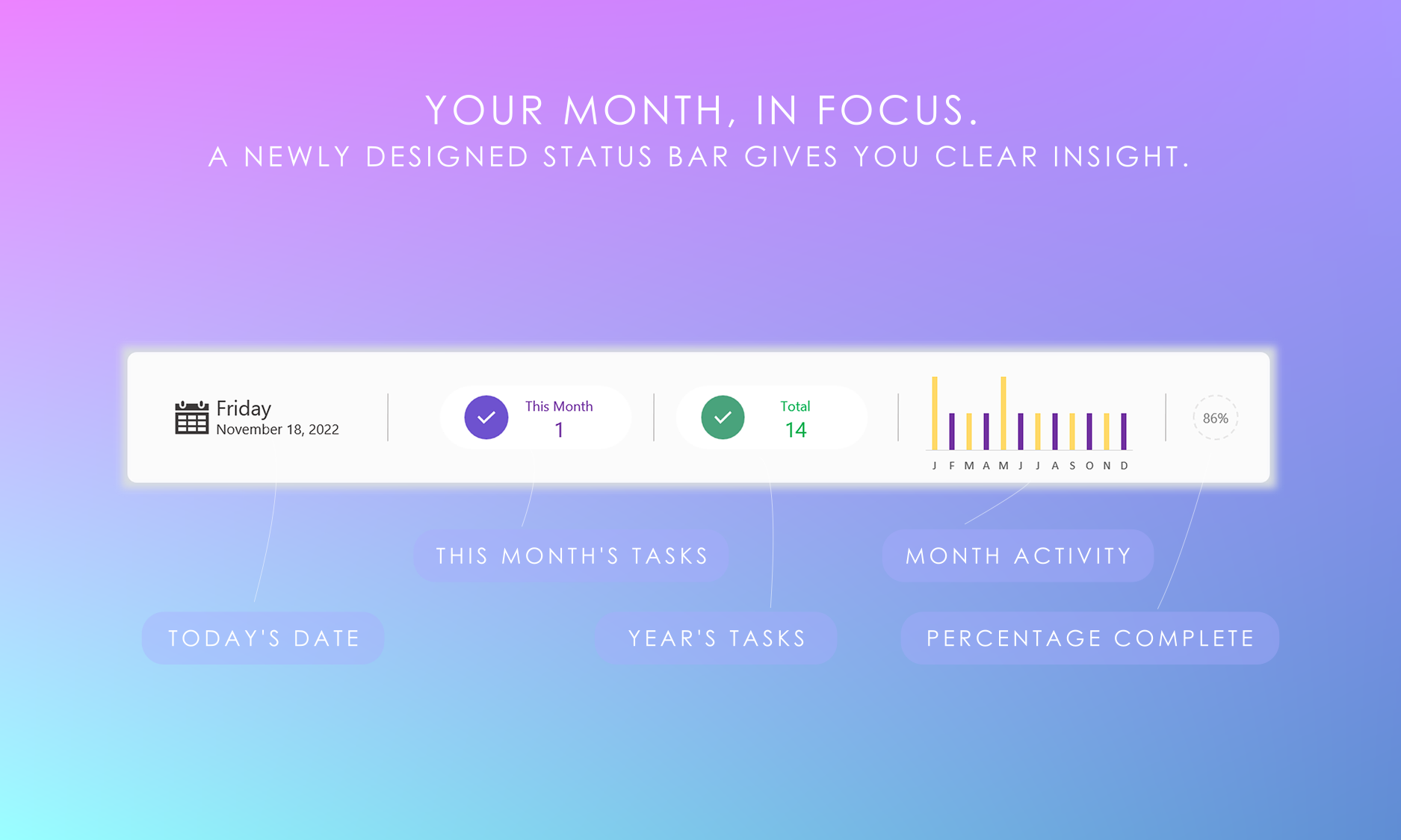 ✔️Modern, colorful status bar displays today's date, task count totals & total completion percentage