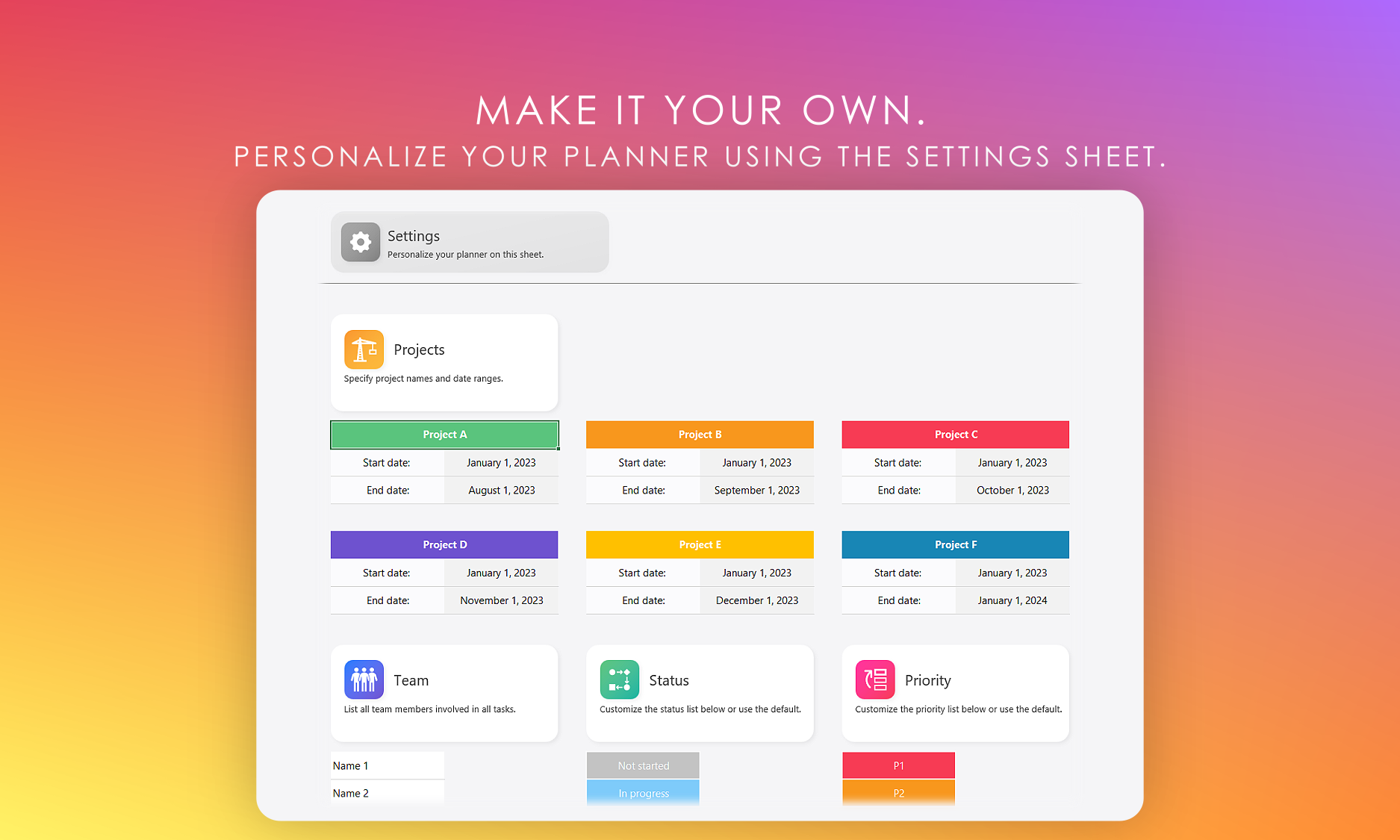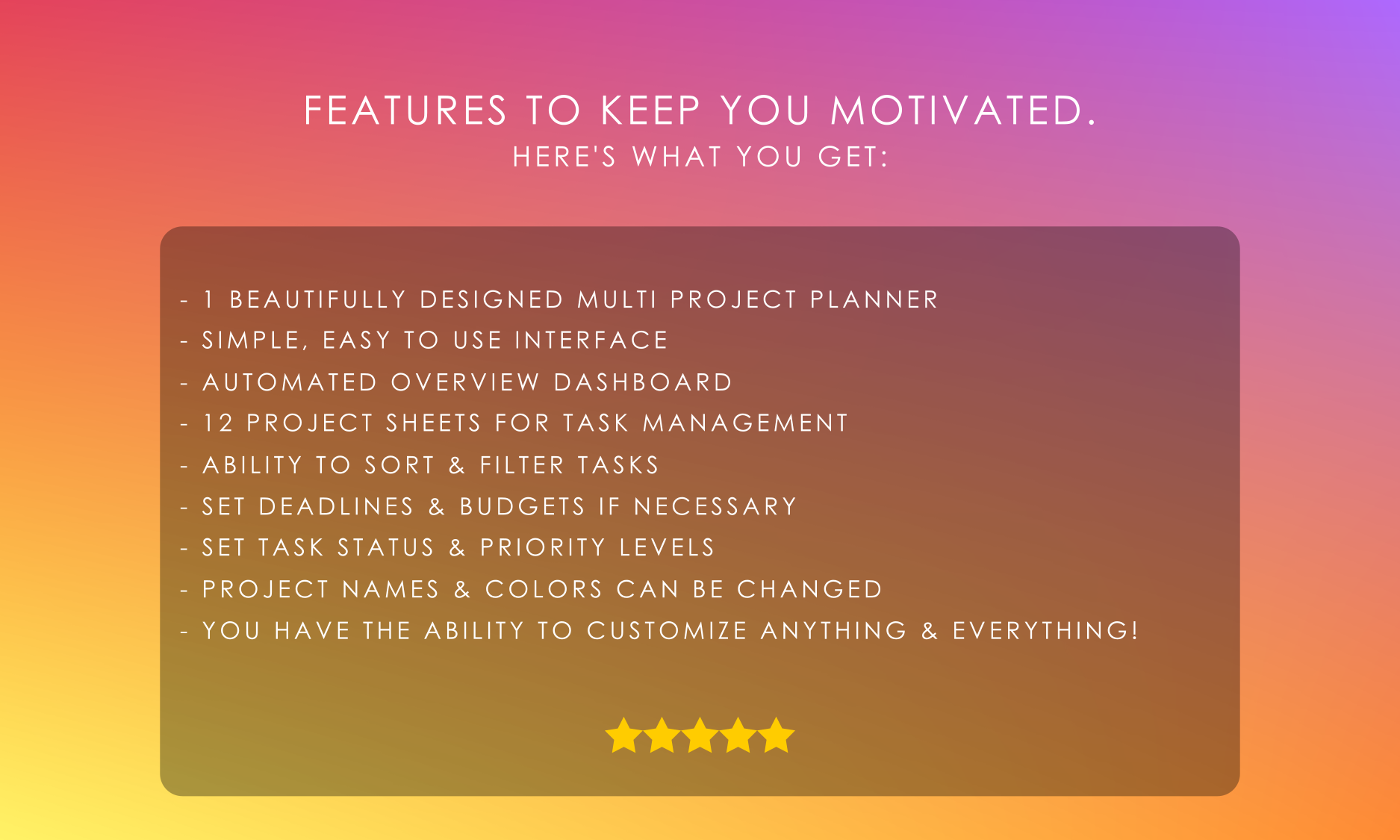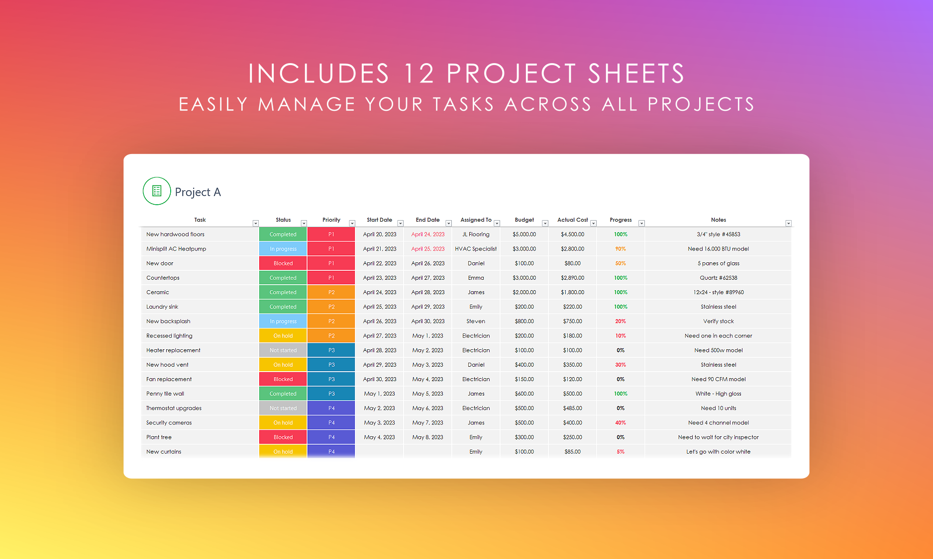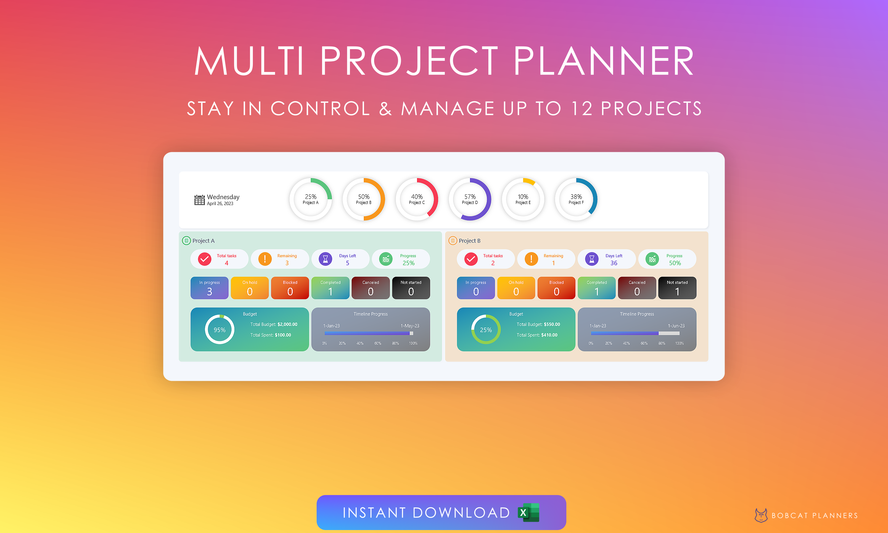 - Description: Plan & organize multiple projects in one easy to use excel spreadsheet. Designed to be intuitive and empower you and your team to stay on top of your projects. Assign tasks to your employees or team member, prioritize tasks and keep their statuses up to date. Set due dates, budgets & percentage of completion. See your project stats at a glance with the beautiful Dashboard sheet, which is completely automated. You'll be sure to impress your team (and your boss) with this high quality planner.