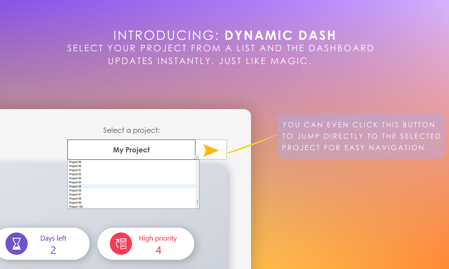 This sheet allows you to review project metrics & statuses at a glance. Dynamic Dash lets you select a project from the drop-down list and the dashboard updates instantly.