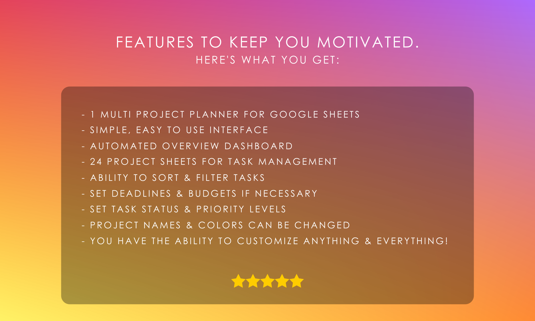 - Description: Plan & organize multiple projects in one easy to use spreadsheet for Google Sheets. Designed to be intuitive and empower you and your team to stay on top of your projects. Assign tasks to your employees or team member, prioritize tasks and keep their statuses up to date. Set due dates, budgets & percentage of completion. See your project stats at a glance with the beautiful Dashboard sheet, which is completely automated. You'll be sure to impress your team (and your boss) with this high quality planner.