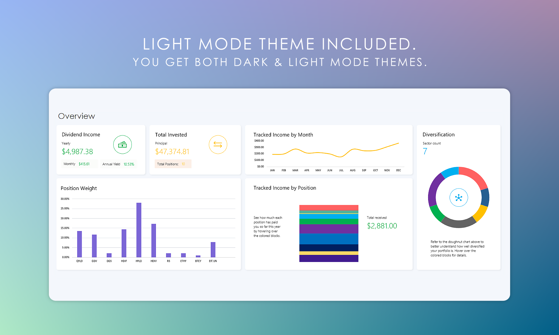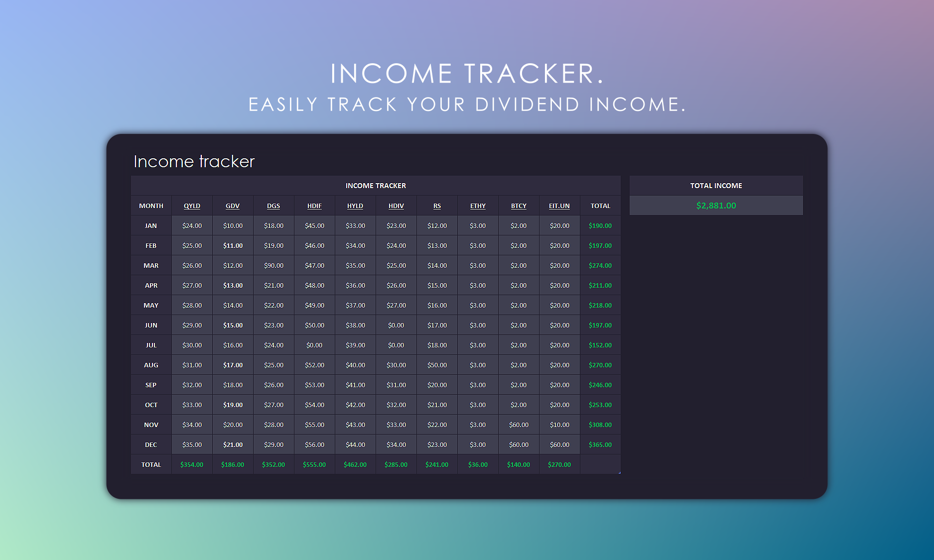 - Description: Plan, track & organize Stocks, Funds, ETFs, and more in this easy-to-use spreadsheet for Microsoft Excel. Designed to be intuitive and empower you to stay on top of your dividend income. A beautifully designed one-of-a-kind dashboard automatically shows you how much you'll make in passive income for the month and year. Your annual dividend Yield % is automatically displayed for you. This planner also lets you track your dividend income and then automatically displays beautiful visuals on the dashboard.