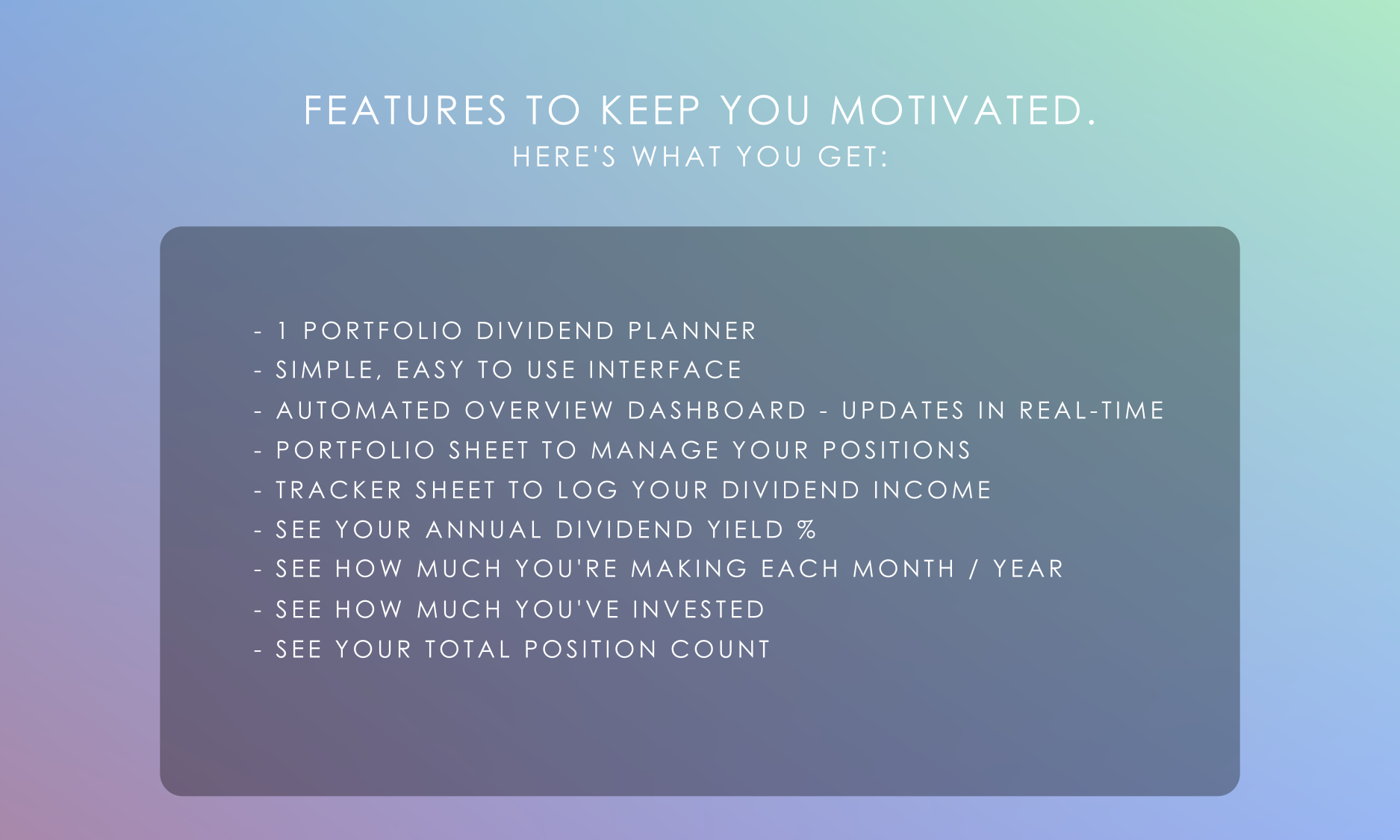 - Description: Plan, track & organize Stocks, Funds, ETFs, and more in this easy-to-use spreadsheet for Google Sheets. Designed to be intuitive and empower you to stay on top of your dividend income. A beautifully designed one-of-a-kind dashboard automatically shows you how much you'll make in passive income for the month and year. Your annual dividend Yield % is automatically displayed for you. This planner also lets you track your dividend income and then automatically displays beautiful visuals on the dashboard.