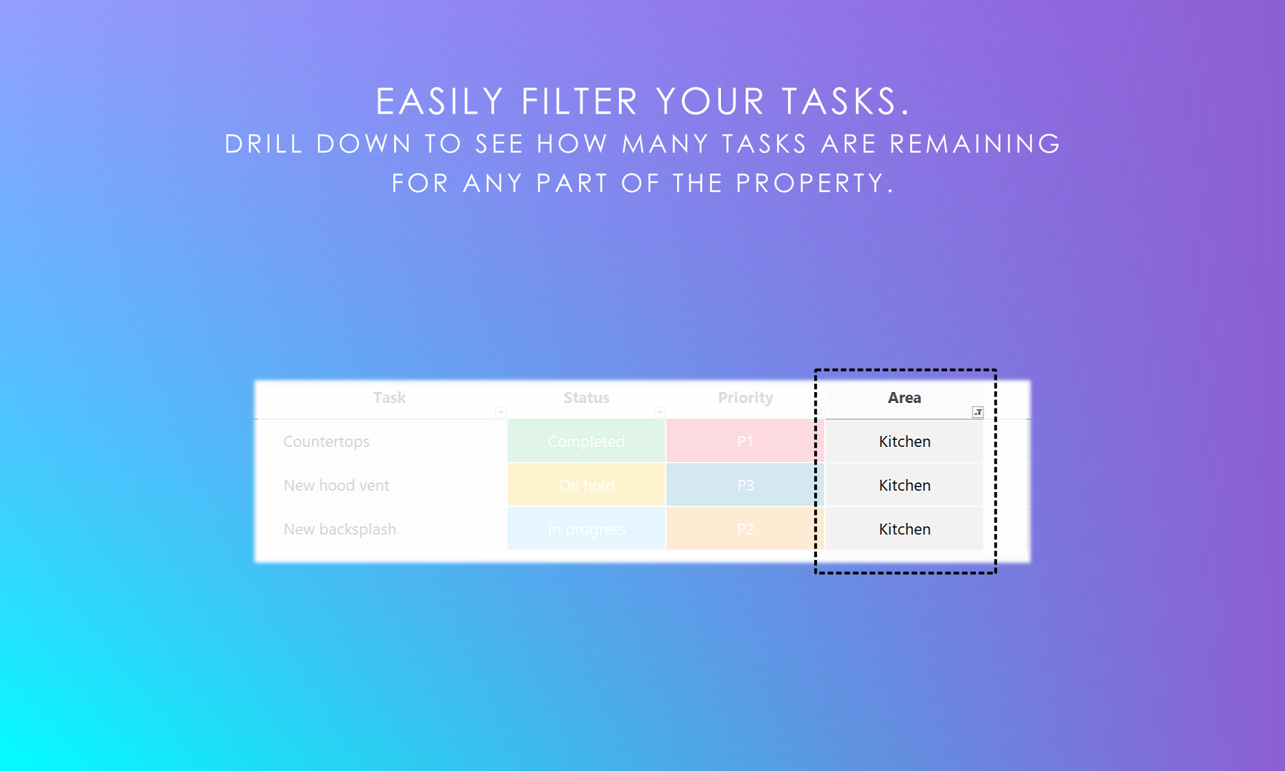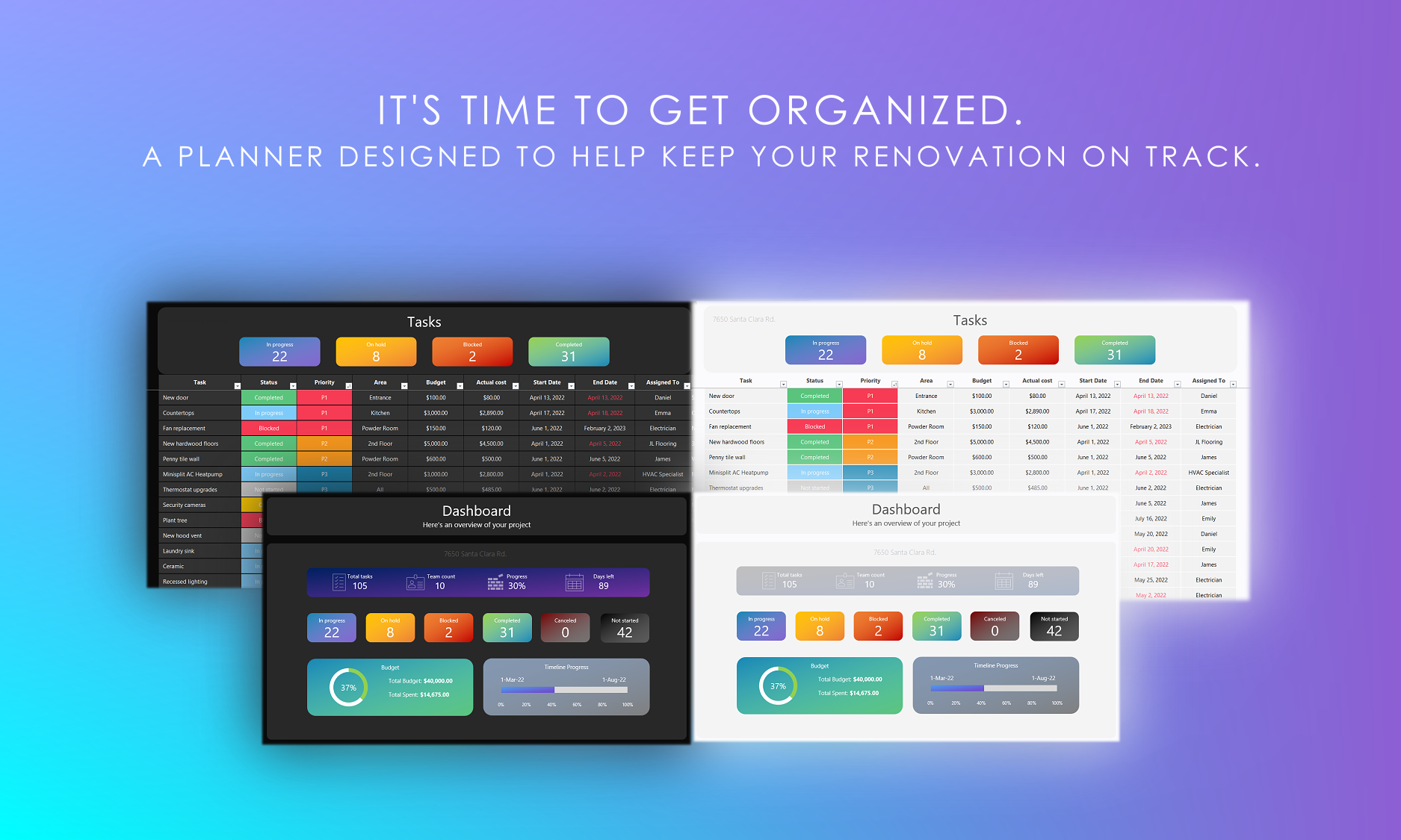 - Description: Plan , track , organize , and budget all your renovation tasks in one easy to use spreadsheet. This visually stunning renovation planner lets you budget & prioritize your tasks and keep their statuses up to date. Choose which area of the property a task belongs to while setting budget & timeline goals. An automated dashboard gives you a clear overview of your project. Perfect for a bathroom renovation, kitchen renovation or whole home renovation. Choose between light and dark mode themes (you get both)!