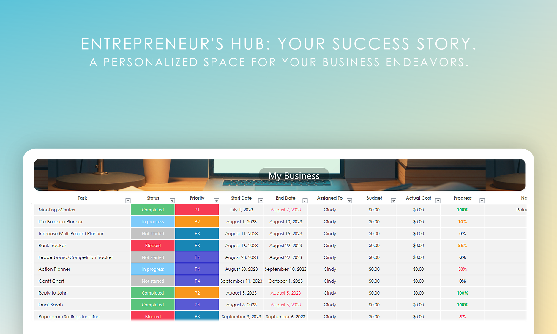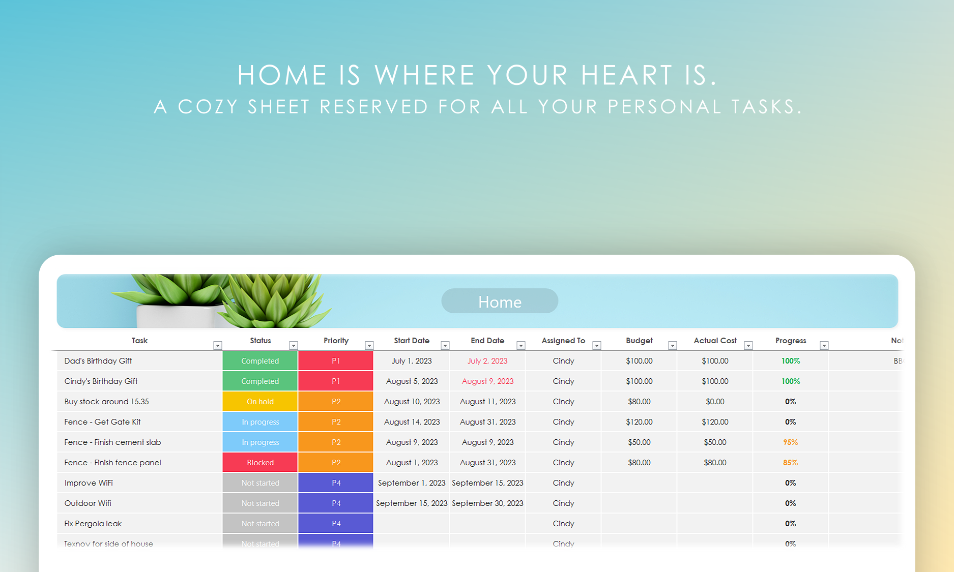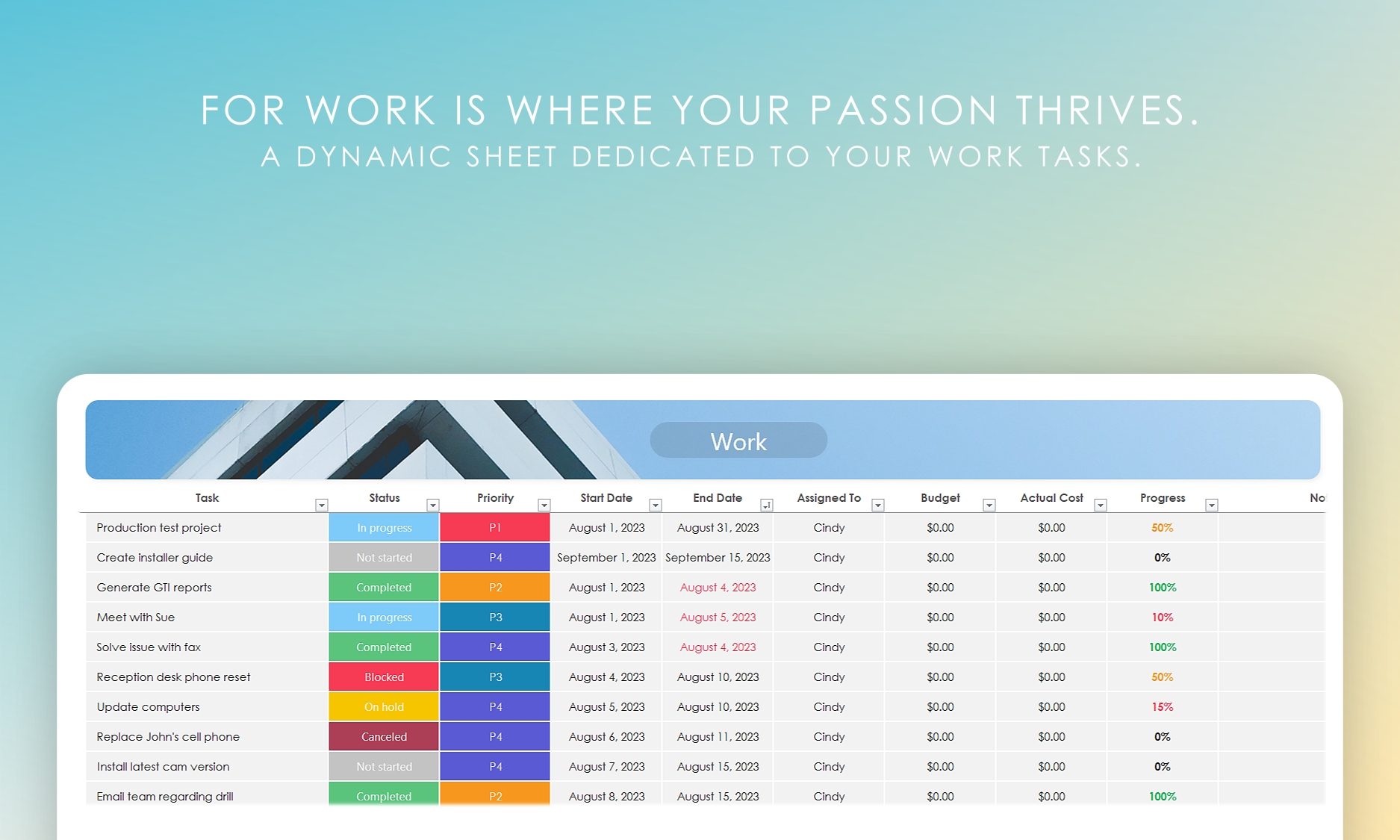 - Description: Have you ever experienced the overwhelming sensation of a cluttered mind, struggling to keep up with the tasks awaiting completion in your personal life, workplace commitments, and perhaps even your side business ventures? Take solace in the fact that you're far from alone—I too was ensnared in this struggle. Juggling tasks and to-do lists across three separate platforms, I reached a point of realization. It was high time to pioneer a revolutionary solution—a Work-Life Balance planner. This innovative tool enables you to record all your tasks within a single spreadsheet, neatly compartmentalized across three distinct tabs. To provide a clearer perspective on the areas demanding your attention, an intuitive dashboard synthesizes the essential information. You can assign tasks to others, prioritize tasks and keep their statuses up to date. Set due dates, budgets & percentage of completion.