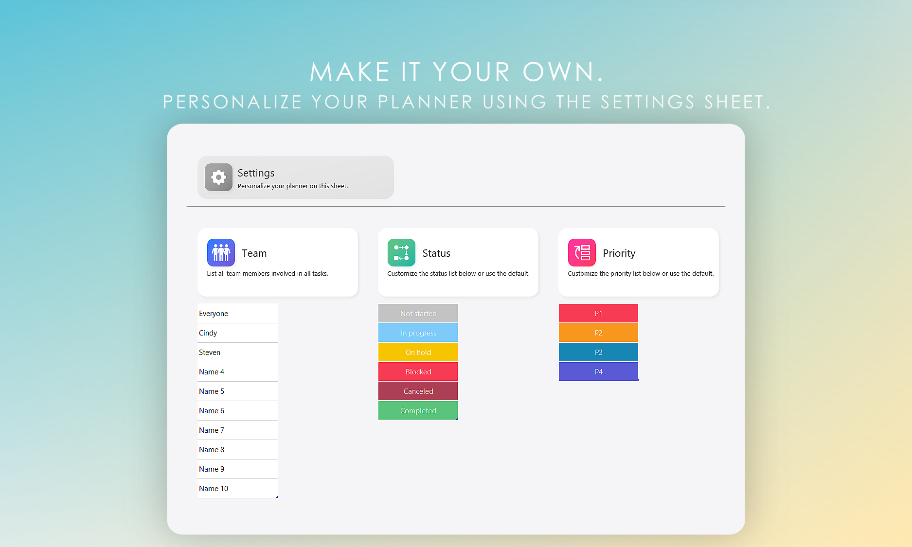 ✔️Ability to assign tasks to other people - You define the list of people from the Settings sheet