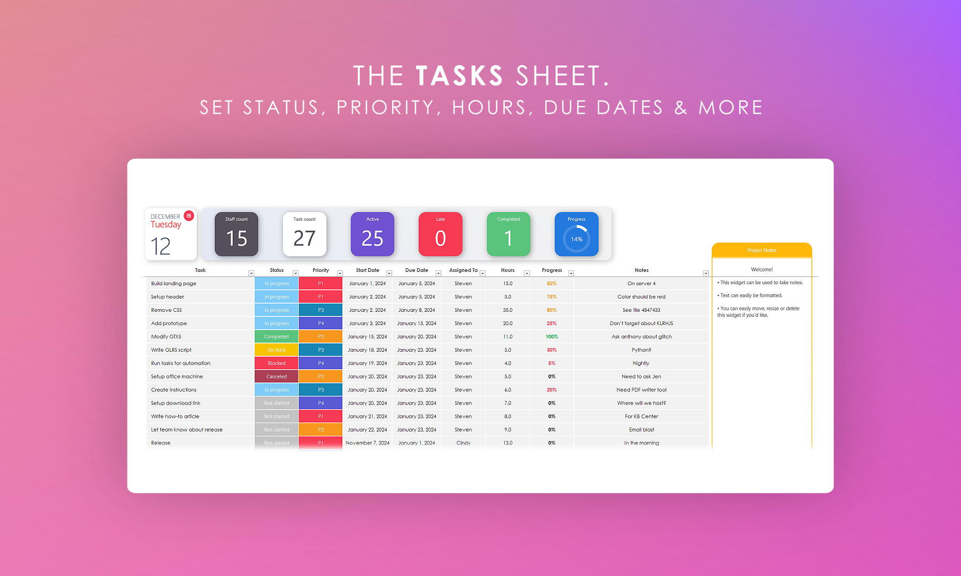 The Tasks sheet is used to manage tasks. Each task contains the following columns: