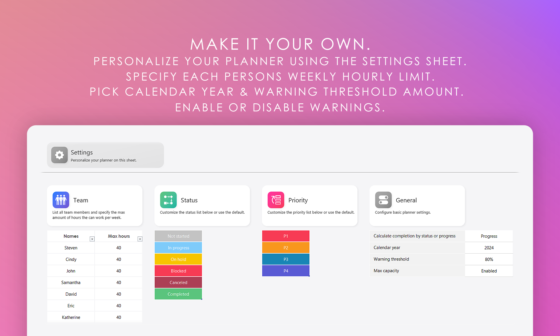 ⚙️But that’s not all! The Settings sheet allows you to customize your Workload planner to suit your needs. Stay ahead of the game with color-coded highlighting options. Weeks surpassing the maximum hours are flagged in red, while those nearing the limit receive a yellow warning. This proactive approach ensures that you can address potential workload issues before they become critical.