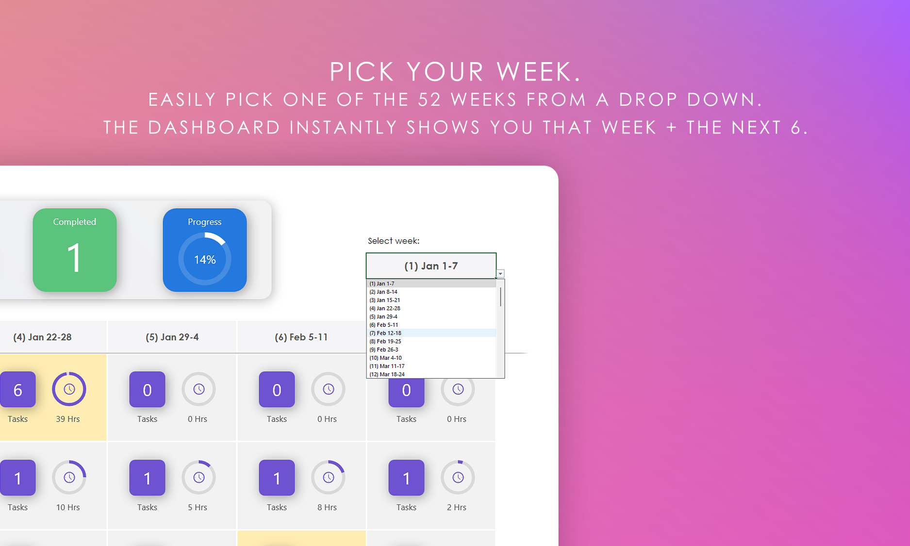 Flexible Viewing Options: With 52 weeks in a year, viewing the entire timeline at once can be overwhelming. Fear not! Our planner allows you to effortlessly navigate through weeks using a convenient dropdown list. Choose a specific week, and the Workload dashboard adjusts to display that week plus the following six, giving you a focused view of the tasks and assignments ahead.